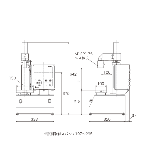 ■標(biāo)準(zhǔn)規(guī)格| 模型 | SVZ-200NB-□ * 1 | | 最大負(fù)荷 | 2kN | 有用的功能 | 測(cè)試條件內(nèi)部存儲(chǔ)器保持功能 峰值/谷值保持功能 循環(huán)操作功能 斷點(diǎn)檢測(cè)功能 起點(diǎn)檢測(cè)功能 自動(dòng)取消/自動(dòng)進(jìn)給功能 自動(dòng)原點(diǎn)返回功能 結(jié)果通過/失敗判斷功能 | | 負(fù)荷顯示 | 請(qǐng)參閱“負(fù)載范圍規(guī)格”表請(qǐng)參閱 “按型號(hào)劃分的負(fù)載范圍組合表” | | 最小單位 | | 負(fù)載精度 | JIS 1級(jí)試驗(yàn)機(jī)(測(cè)量指令值的±1%以內(nèi)) | | 最小排量單位 | 0.01毫米 | | 驅(qū)動(dòng)系統(tǒng) | 無刷直流電機(jī) | | 速度范圍 | 5至500毫米/分鐘 | | 中風(fēng) | 130毫米 | | 樣品安裝跨度 | 197-295毫米 | 外部輸出* 2 | USB | | 到支柱的距離 | 100毫米 | 電源供應(yīng) | AC100V 5A | | 工作臺(tái)尺寸 | 100 x 150毫米,帶T形槽 | 體重 | 約35公斤 | | 安全設(shè)備 | 任意設(shè)定上下限開關(guān),過載自動(dòng)停止 | 外形尺寸* 3 | W338 x D357 x H642 mm(圖紙顯示) | * 1在□欄中輸入載荷符號(hào)模型。請(qǐng)參照“各型號(hào)的負(fù)荷范圍組合表”。 * 2可以添加用于模擬或打印機(jī)的可選外部輸出。 * 3所示的高度尺寸是升降軸的下限。