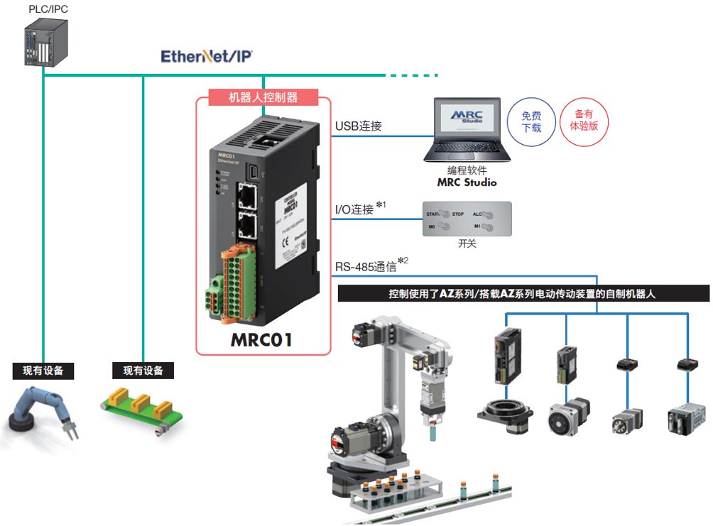 MRC01即使是控制的初學(xué)者,也可簡單通過開關(guān)的ON/OFF來直接控制運(yùn)行。另外,可以和既有的PLC連接進(jìn)行自動(dòng)運(yùn)行、也可通過連接對應(yīng)EtherNet/IP?的PLC/IPC、觸摸屏一邊監(jiān)控一邊自動(dòng)運(yùn)行。 機(jī)器人控制器MRC01